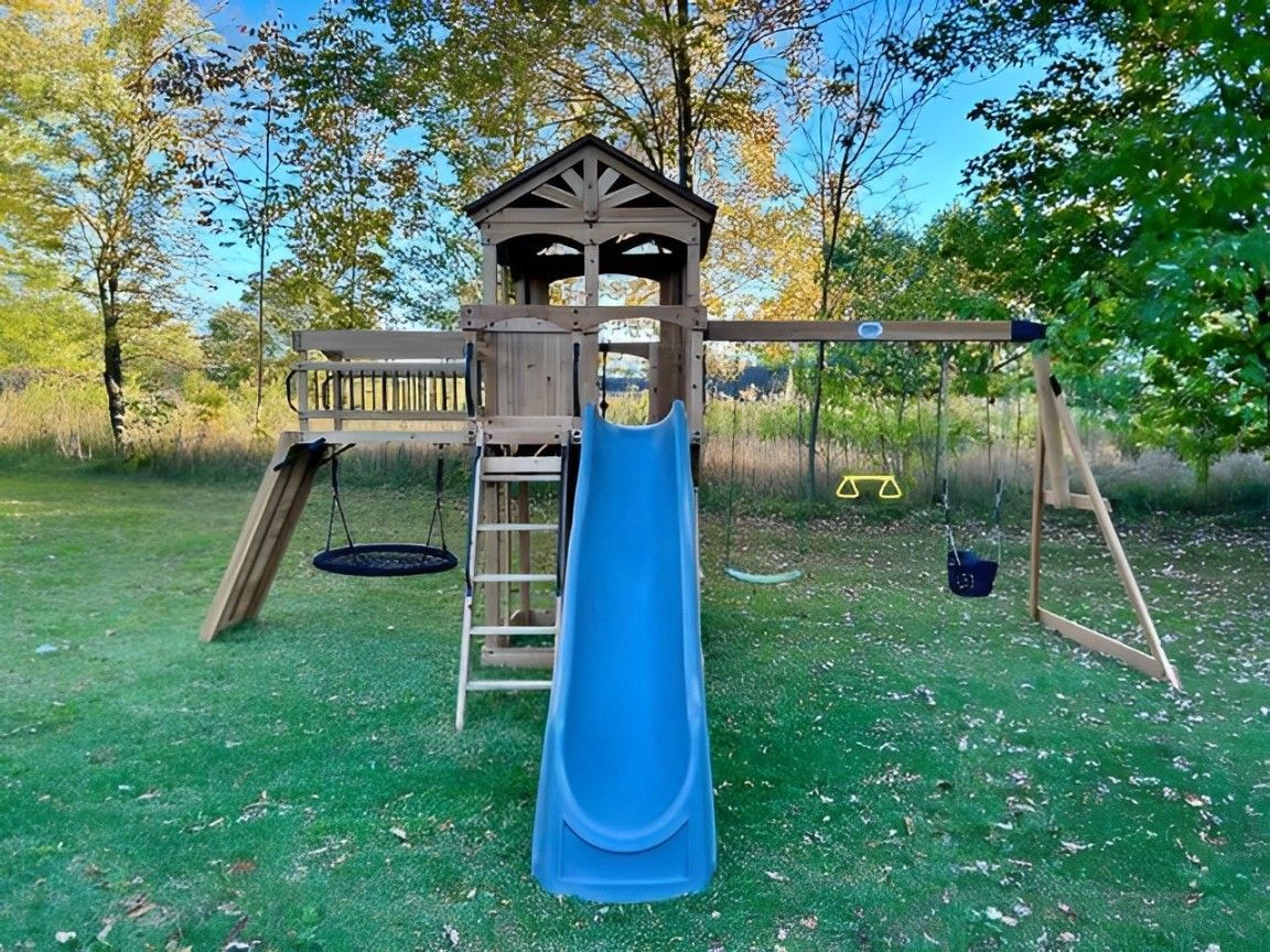 A playground with a slide , swings , and trees in the background.
