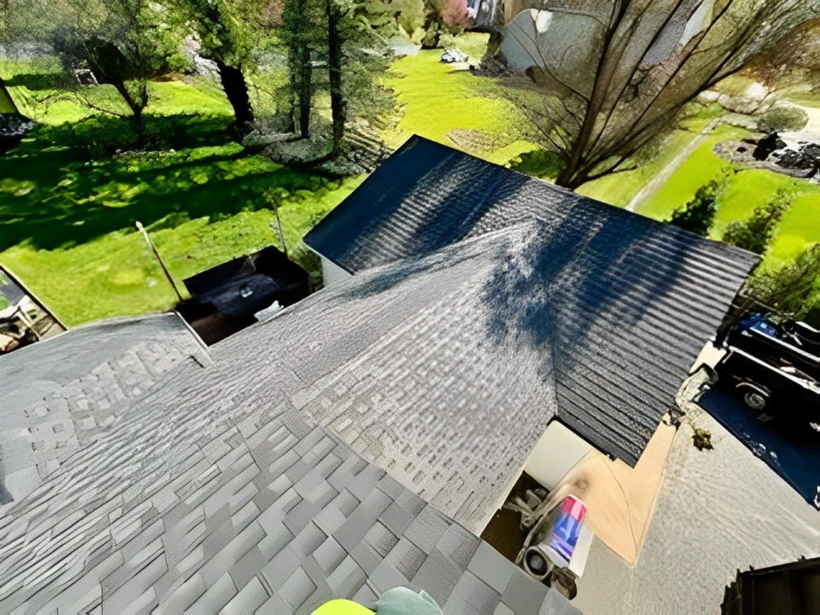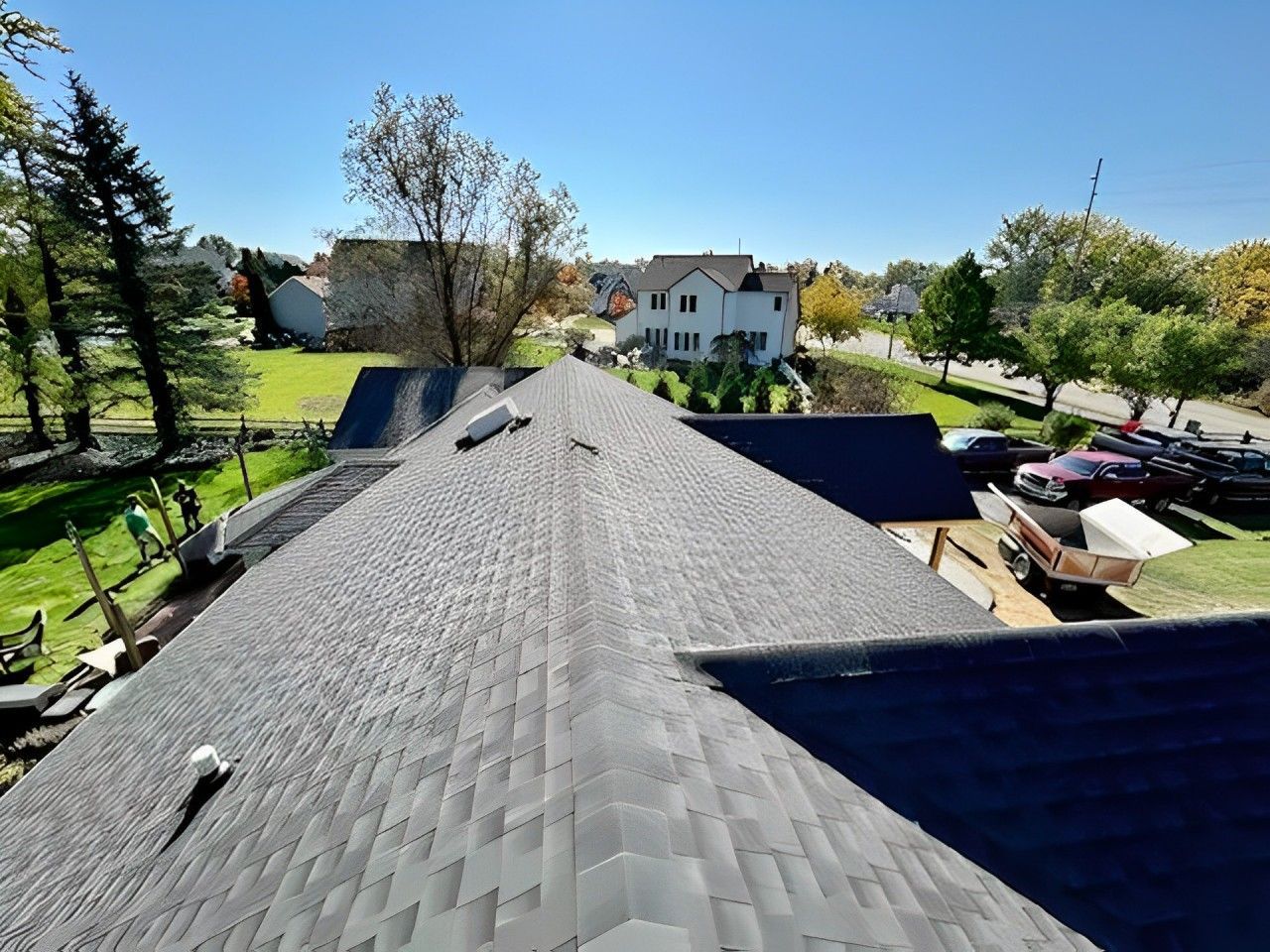 A view of a roof from the top of a house with trees in the background.